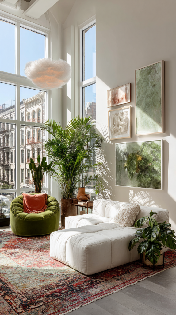 Maximalist artistic lofts are all about embracing abundance and vibrant energy. They turn your living room into a dynamic canvas of art and expression. This design style is perfect for those who love to surround themselves with art, color, and texture. It creates a space that feels lively and eclectic.