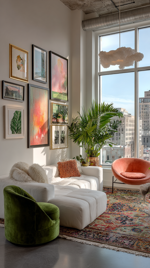 Large paintings, mixed media, or bold prints can turn a wall into a focal point. The art should show the owners’ personality and enhance the loft’s look.