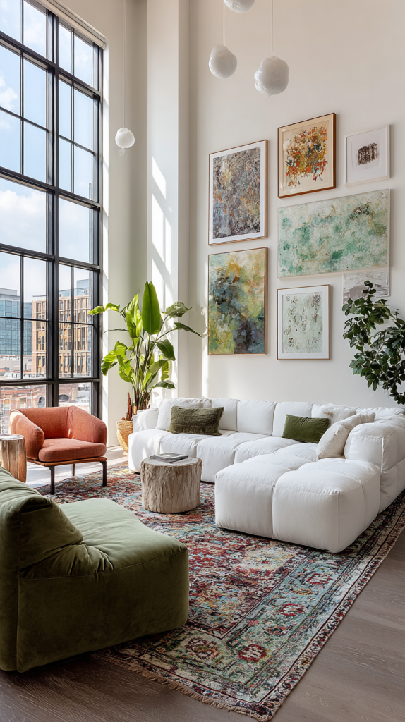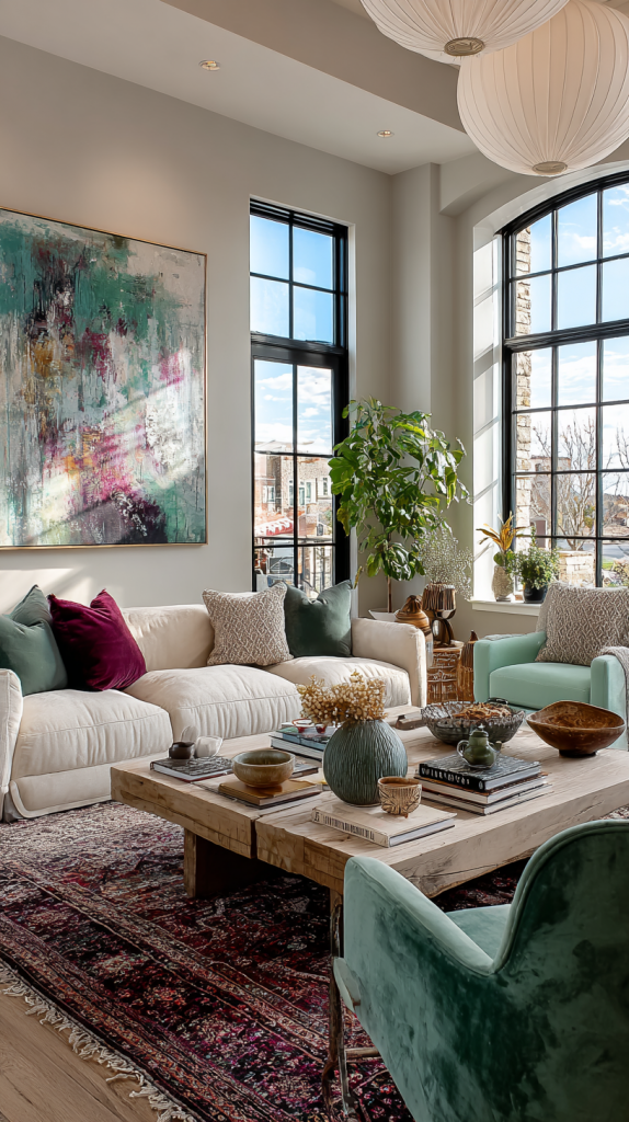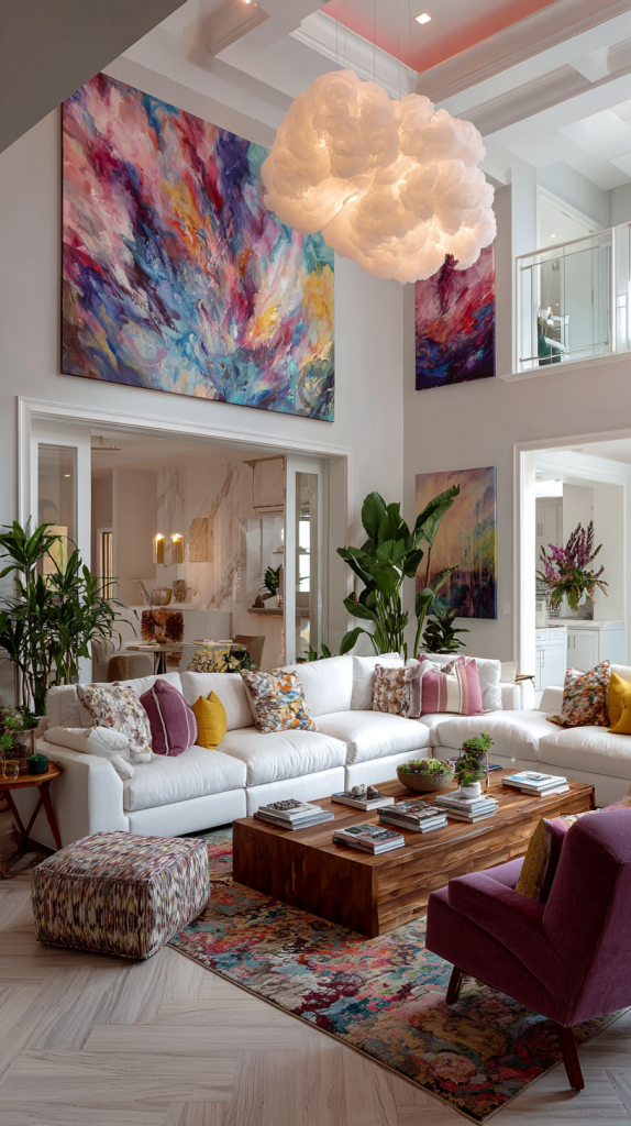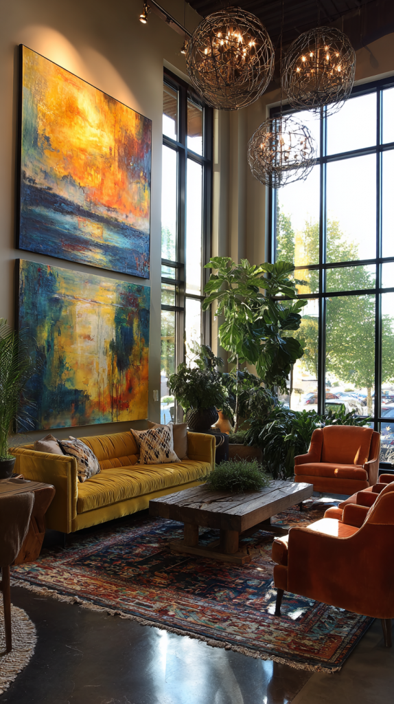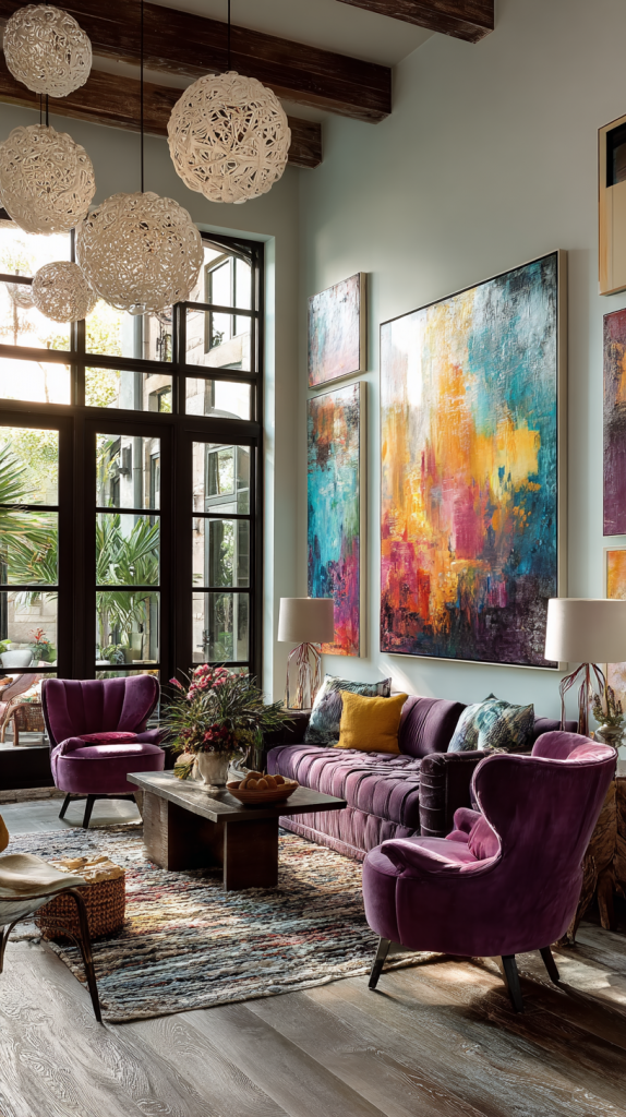 Statement art is key in eclectic living rooms. These pieces are bold, colorful, and unique. They add character to the room.