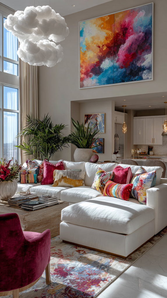 A bold, colorful art piece can be the living room’s focal point. It ties together the soft and eclectic elements.